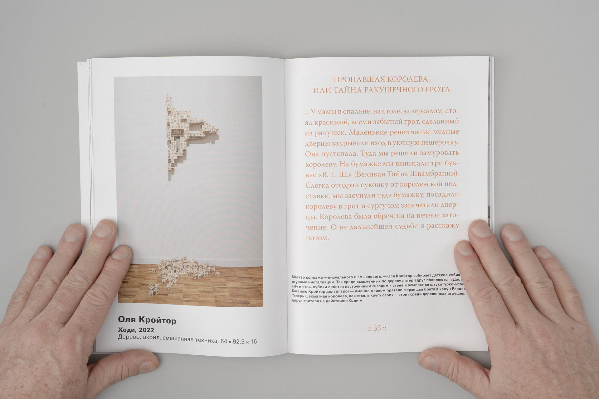 Catalogue for art exhibition devoted to cult children book "The Black Book and Schwambrania" by Lev Kassil. 17 contemporary artist presented works which explore themes from or accordant to book. To show this link between text and art works and to recognize text as inspiration and equal part of exhibition, there are rich quotes from book on both covers and separate pages looks like pages from real book (which chapter titles and page numbers) by typography. There are two other layers of text — from artists and from critics. For every type of text — its own typography.
